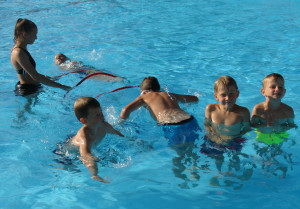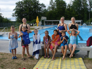 Wasserrattengruppe im Freibad, welche das erlernte Schwimmen durch zusätzliches Training verfestigt haben.